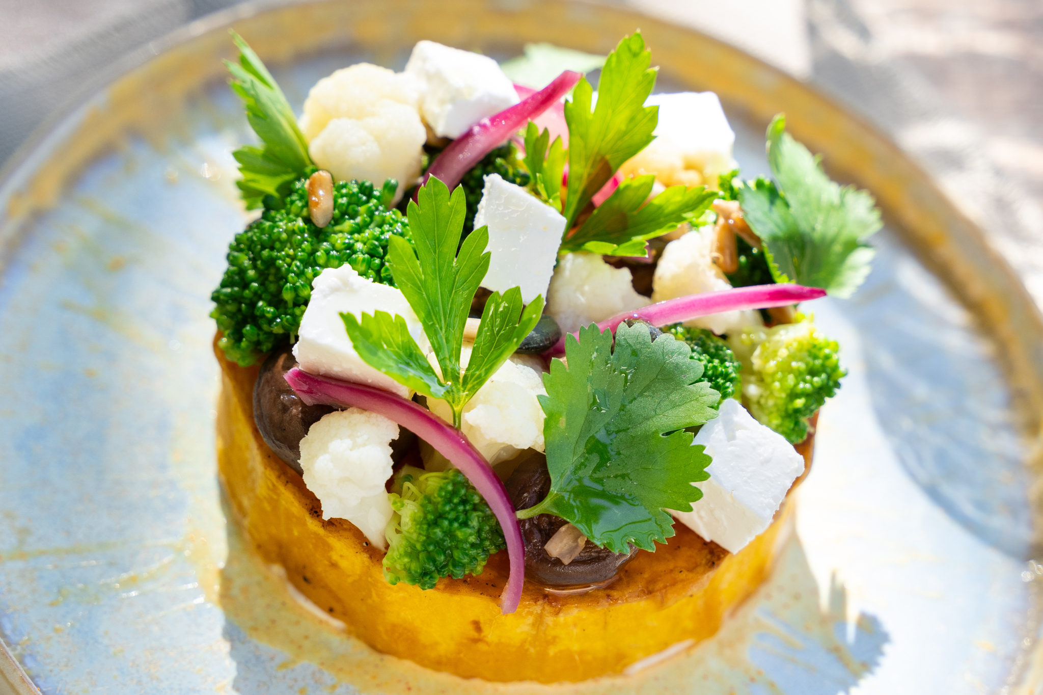 Monter les Smörrebröd en disposant les légumes sur les disques de butternut puis terminer par le chèvre, les tranches d’oignon rouge, les graines de courge, les herbes et un filet d’huile d’olive.
